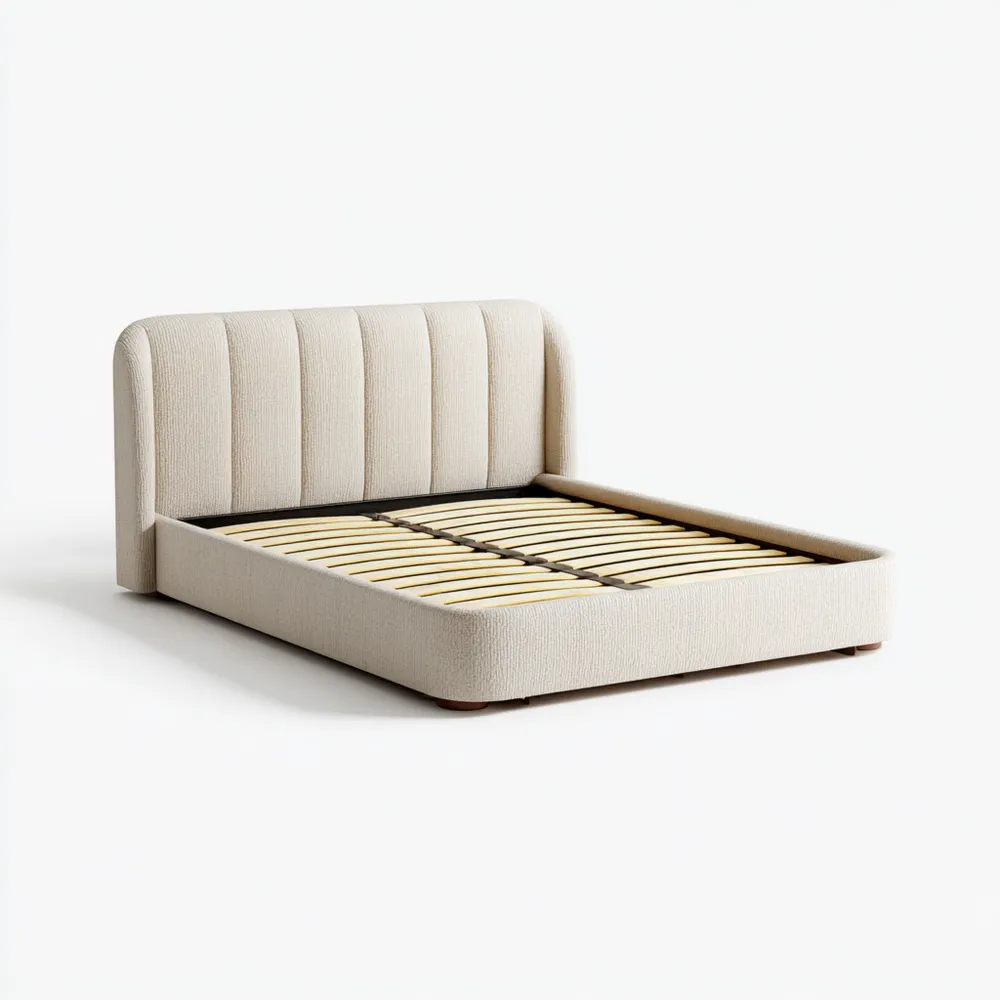 ベージュの高品質ファブリックを使用し、耐久性と快適さを提供します。ヘッドボードはソフトパディングでサポートされ、リラックスした時間をお過ごしいただけます。